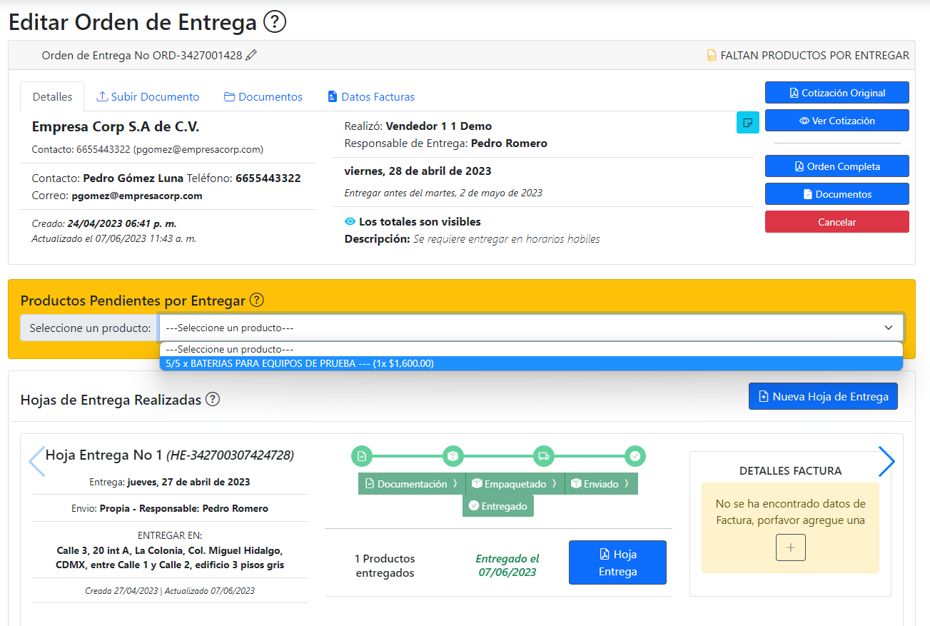 Por medio del módulo de pedidos y módulo de entregas, registra toda la logística y documentos relacionados (facturas, notas, etc.) que se involucran en tu servicio al cliente final. Efectúa entregas parciales o totales y administra eficientemente tu relación con el cliente.